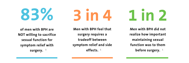 There are different ways to treat BPH: medication, minimally-invasive procedures, and surgery. Choosing a treatment option is sometimes overwhelming for men, often resulting in choices they do not truly want. This could mean not responding well to medication, getting limited relief, having a long recovery time, or even having issues with sexual function.